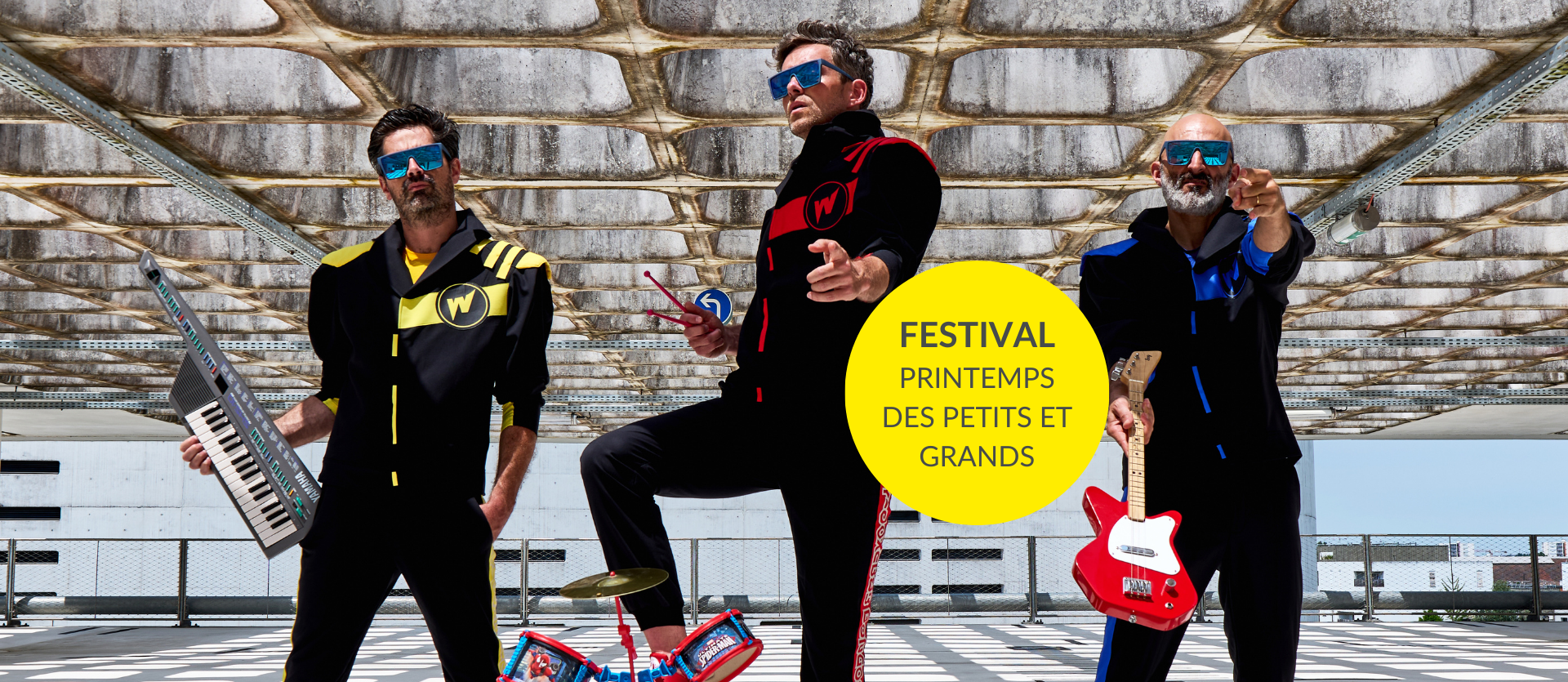 Avec BLOWMASTER (Wacky jaune) : guitalélé, keytar Yamaha SHS-10, boomwhackers, cloches multicolores Fuzeau, mini piano à queue, mini basse, tiny piano Korg, stylophone, Fuzeau percunot’, micro Hello Kitty, chant.
